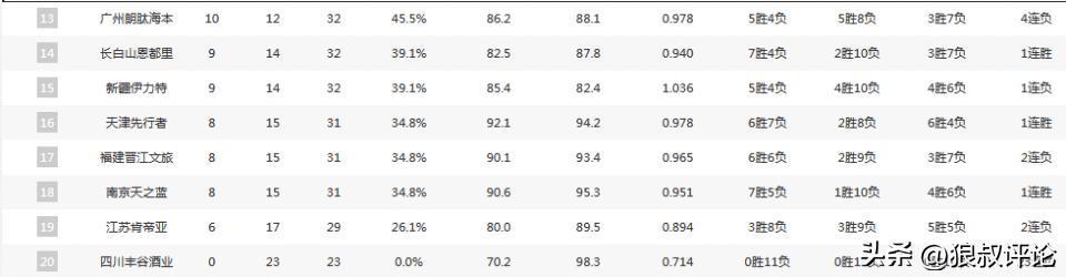 从挑选的外援到本土球员综合实力,广厦,广东,上海位居前三是符合外界的预期,但北京跌至第七出乎意料,辽宁更是从上个赛季的争冠热门,跌到季后赛附加赛的守门员名额,山西,新疆都由于各种问题排名靠后,宁波成为第一阶段最大的黑马,四川由于欠薪风波达到了0胜23负的惨淡战绩。